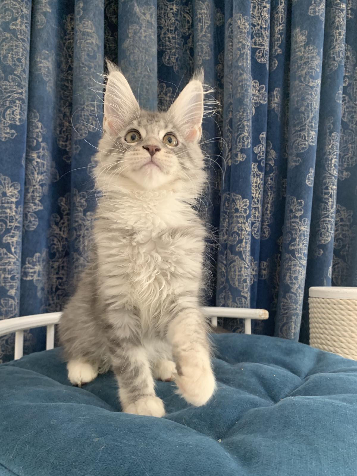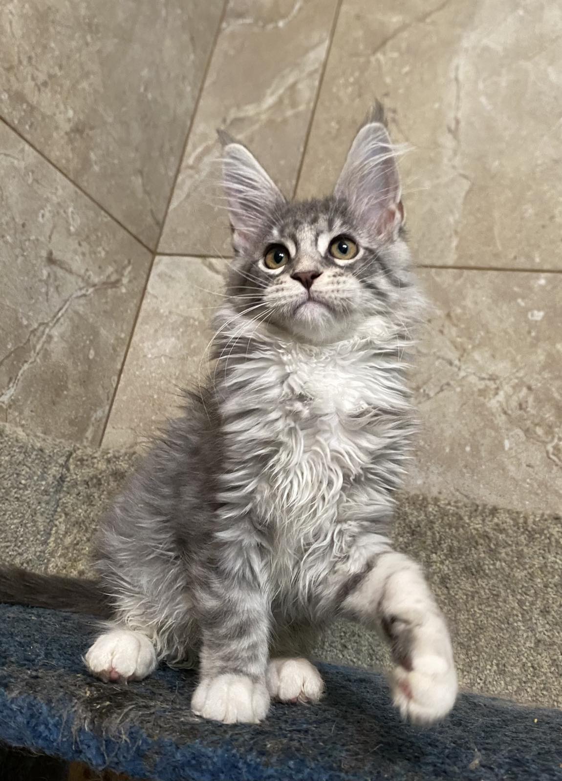 The little maine coon girl Ontario has an interesting coat Blue Silver color, a well-shaped face, and fluffy ear tufts.